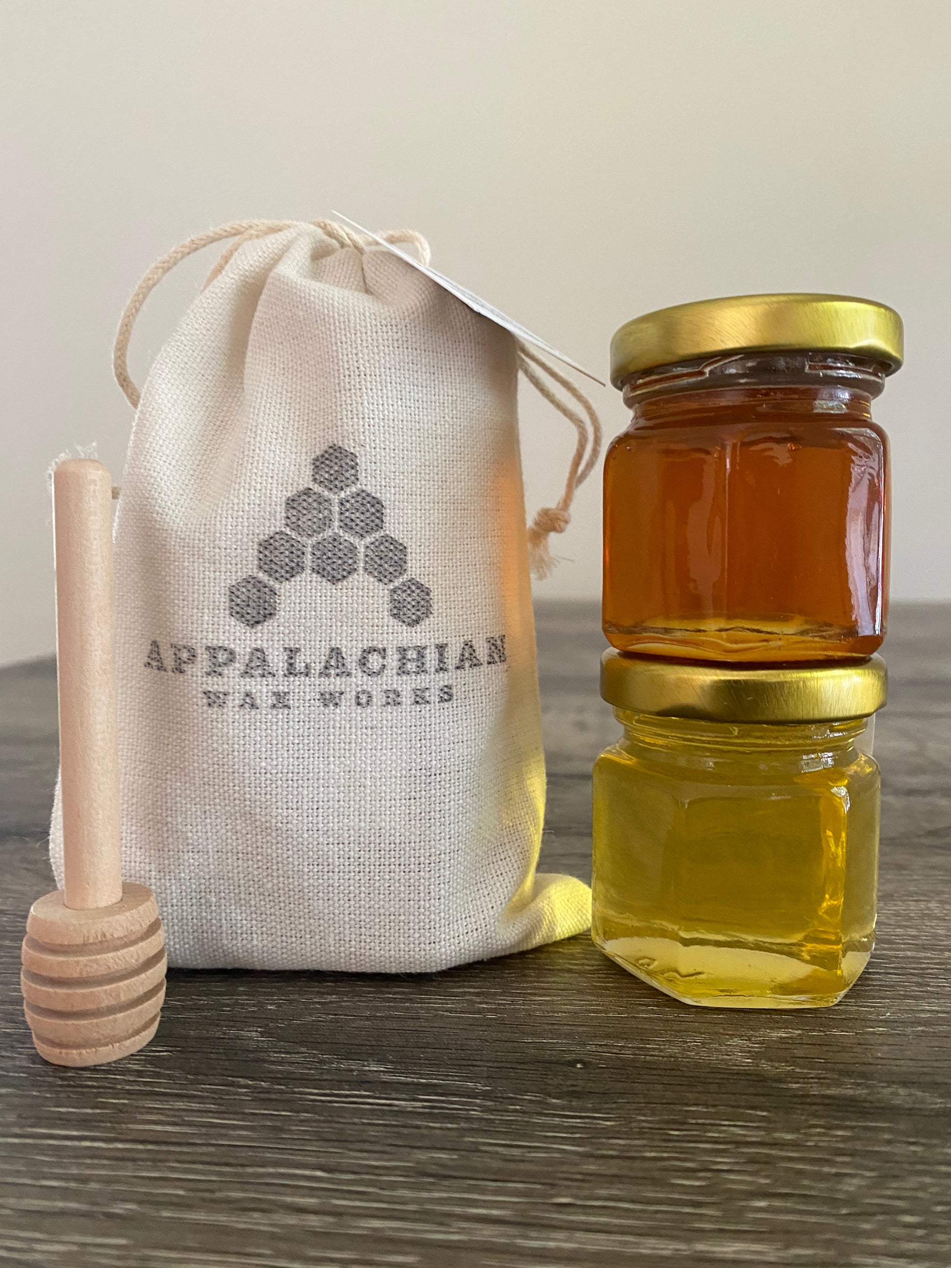 Includes: one muslin gift bag, 2, 1.5oz jars of honey, mini honey dipper.